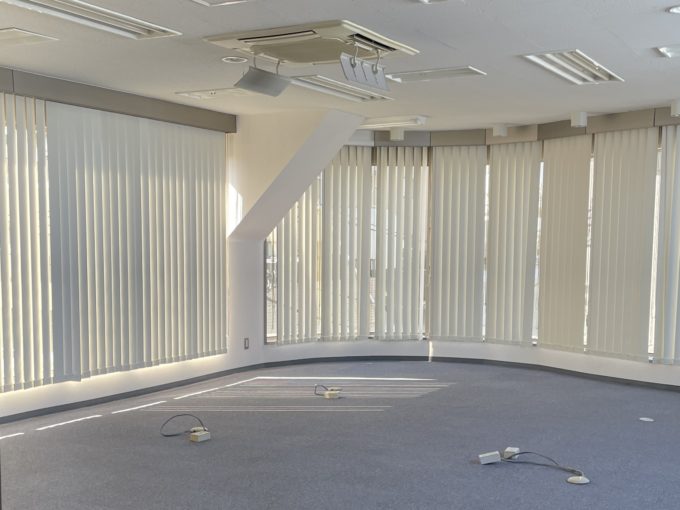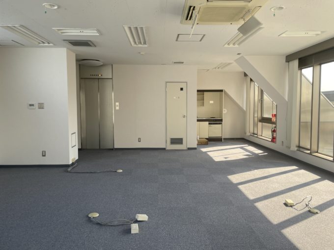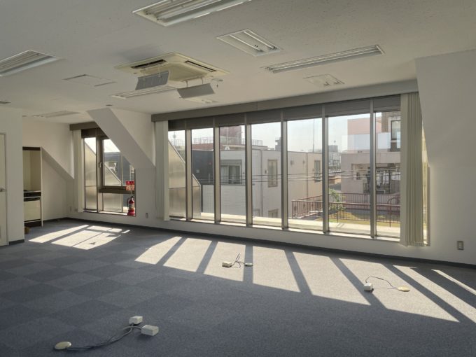 エレベーターで4階までいくと室内に直結した区画。室内はOAフロアに天井はった蛍光灯と一般的な事務所仕様だが窓が大きく3面採光で明るい。西日が差して気持ちのいい空間。縦長い窓にはバーチカルブラインドがついていて閉めても良い雰囲気。天高はないが日当たりがよく物撮りなんかには良さそう。