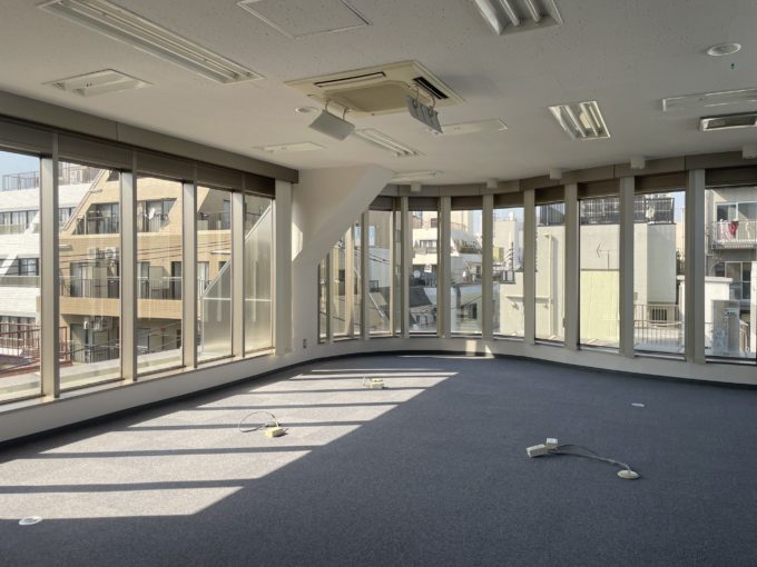 窓窓窓!日当たりもいいし天井抜いたら結構良さそう!と思ってスケルトンではないのですが記事書いております。スケルトン化はオーナーさんと要相談です。タイルカーペットを剥がしたらリノリウムぽい白い床になってました。これもハツリたい…カーペット剥がすだけでも印象変わりそうですね。