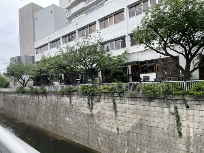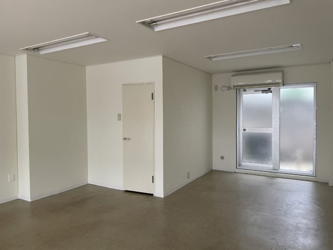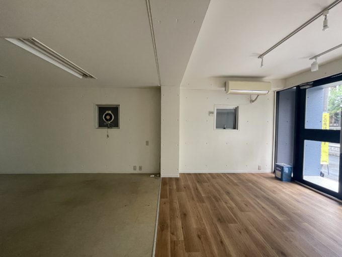 中目黒駅から徒歩5分。東口を出て、ニトリの裏手、皀樹橋を渡った先にあるビルの1階。隣にはおしゃれな沖縄の焼き物屋さんが入っています。開口部はガラス面になっており、南西向きのため晴れていたら陽が入りそうです。室内の真ん中あたりで床の素材が異なり、そのラインで事務所と店舗部分を分けて、ギャラリーやショールーム、物販店として良さそうです。ただ14坪の区画にルームエアコン1つなので、事務所スペースにも増設が必要かもです。天高は2.4mと低めですが、原状回復ありきでスケルトンにすることも相談可能。