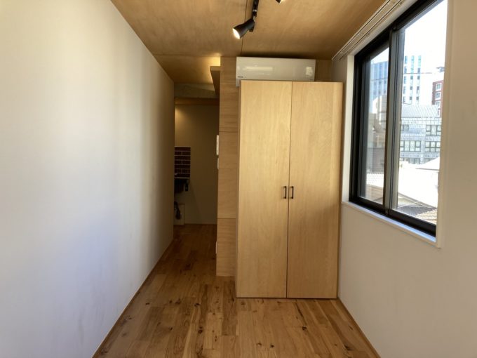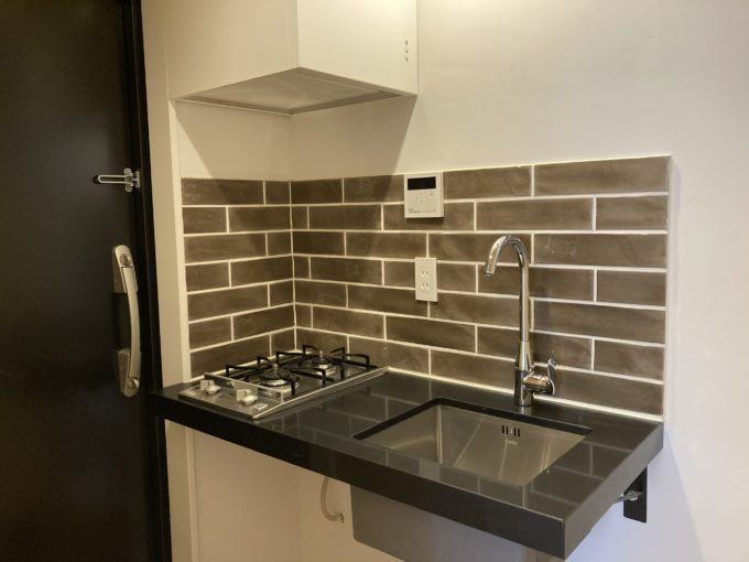 階段で4階まで上がり、ドアを開けるとすぐ横にモダンなキッチンとシンクがお目見えする。その奥には二面採光で明るいお部屋がある。オフィスとして利用するのはもちろん、ここでプライベートサロンを開くのも良さそう。