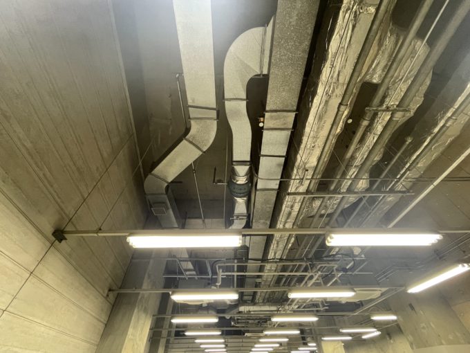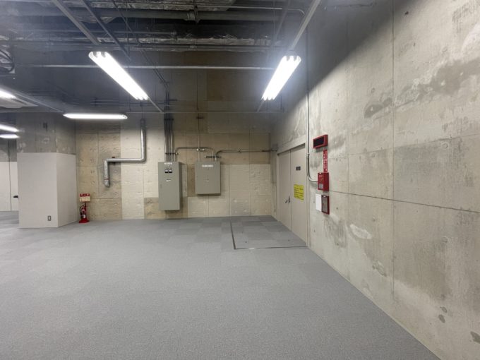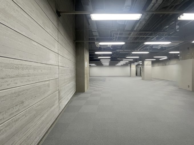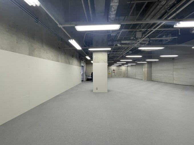 春には建物の前に桜が咲き誇る素敵な通り沿いのこちら。低層ビルだがミラーガラスでカッコがついている。エントランスには椅子とテーブルがあり、待ち合わせやちょっとした逃げ場として使用できる。募集区画は地下一階のため階段を利用したほうが早そうだ。室内はワンルームと共用部に男女別トイレが完備。天高は5.7mあるようだが、照明が落ちてきているため体感は4mほどだろうか。不特定多数の方が出入りする業種はNGです。