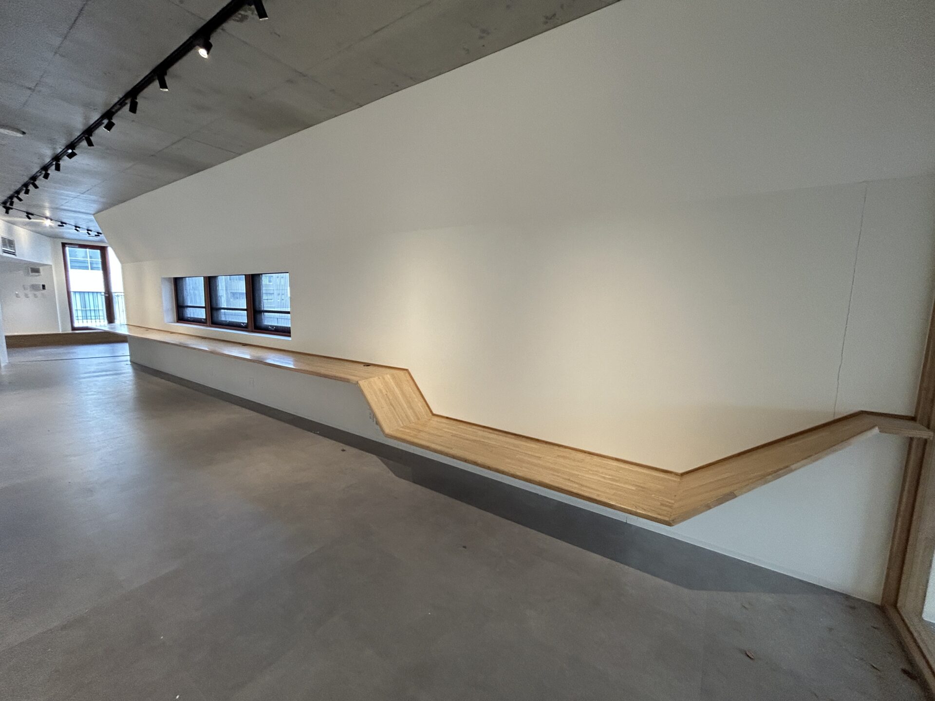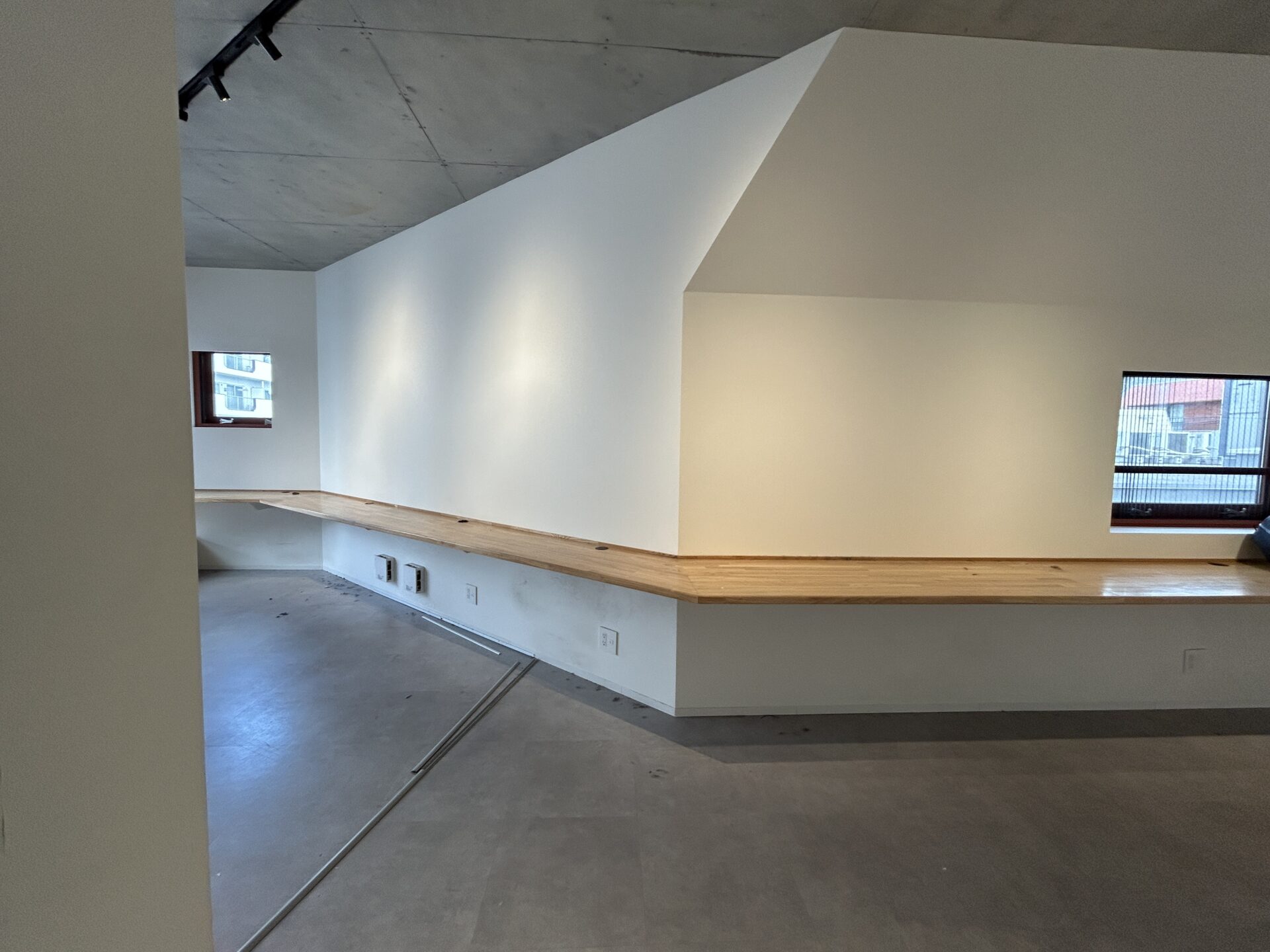 端から端まで続いている木目調のカウンターは、デスク・ベンチ・棚として使用できるようになっていて、