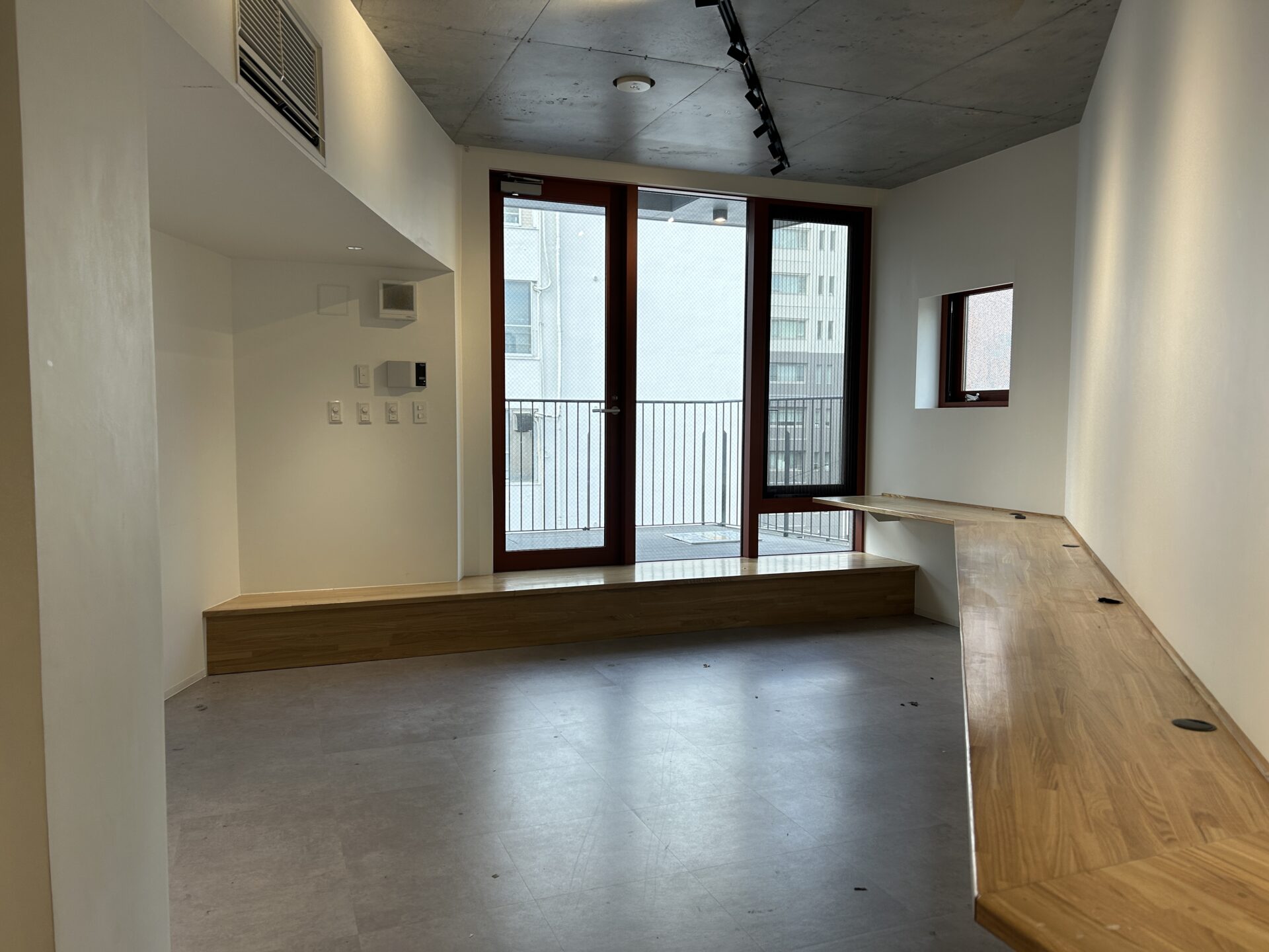 入口入って左側には透明の仕切り扉もあり、オフィスとして使用する場合は会議室としてそのまま使えそう。