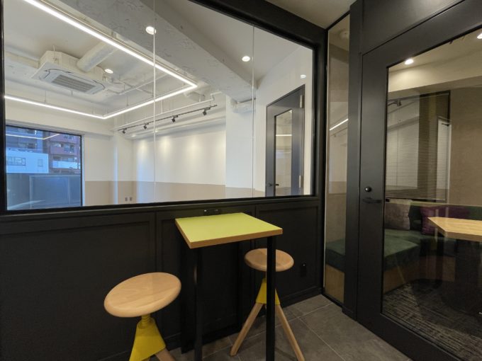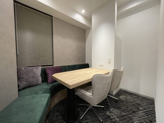 スケルトン天井の今風なおしゃれ空間でありながら、水回りや会議室など綺麗な設備が充実したセットアップオフィスです。執務質は8名程度で利用できる広さで、トイレや会議室が分かれているので導線やレイアウトの自由度が高そうです。会議室前にある2名掛けの小テーブルでちょっとした打合せや休憩ができるのもgoodポイントですね。
