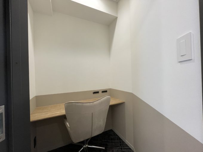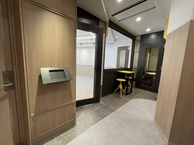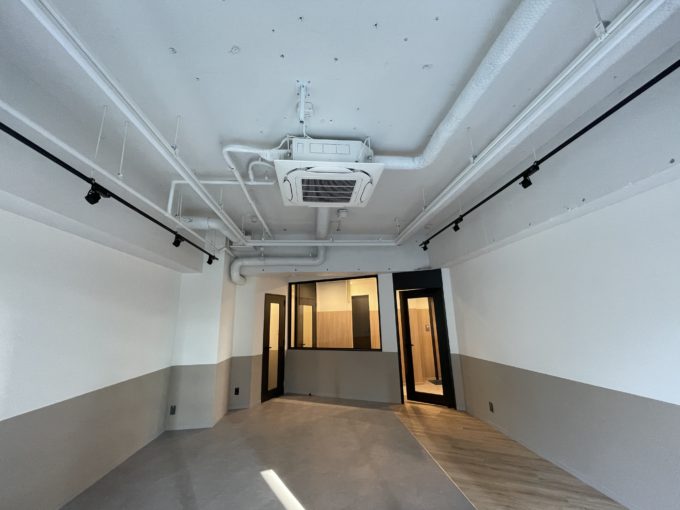 エレベーターを降りて正面に受付モニター台とその先には執務室、右手に4名掛け会議室と男女別トイレがある。執務室は天井が抜けたホワイトスケルトン。天高は3.1mと開放感がある。床壁は綺麗に貼ってあるので家具を入れればそのまま入居できる。室内にはzoom会議や集中作業に最適なテレカンブース1室つき。