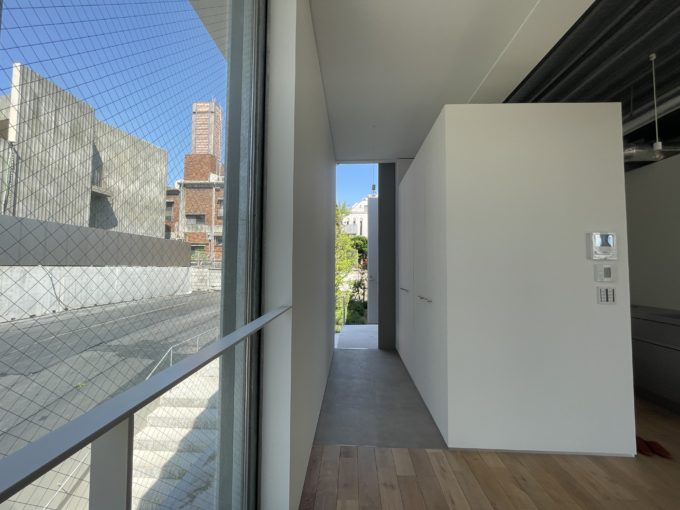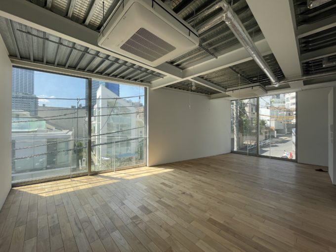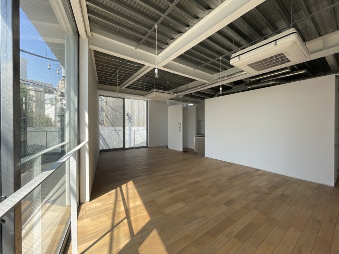 室内の道路に面した窓は西向きで、暖かい日差しが入っていました。天井はスケルトンでシルバーのライティングレールが走っています。天高が3m、床から天井までの全面ガラスが2ヶ所あって開放感が抜群です。床は淡いテイストのリアルな木。