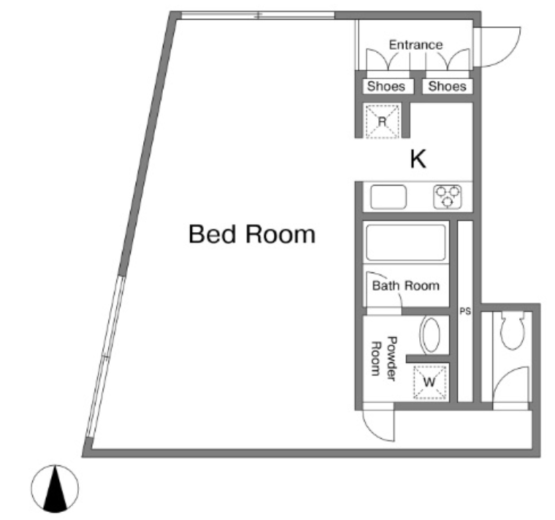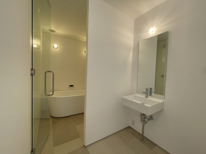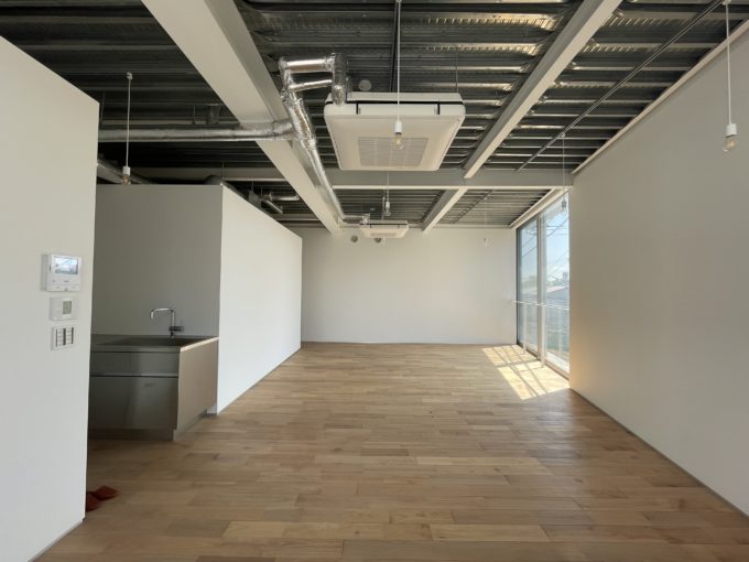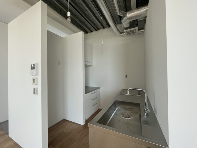 住居仕様になっていて水回りの3点とシステムキッチンが完備されています。用途としては住居のほか、事務所、ギャラリー、スタジオなどがご相談可能。登記も可能です。事務所であれば入口付近に簡単な打合スペースを設けて、真ん中にデカ机をドーーンと置きたいです。