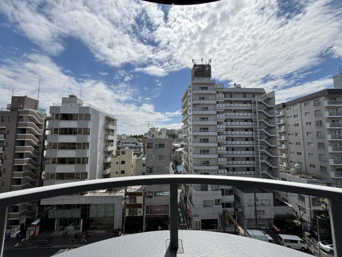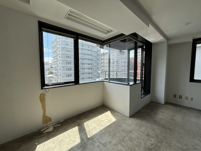 2面採光の南西向きで明るく、バルコニーからの眺望も抜けています。元美容室の区画の内装と7階のスケルトン床、を組み合わせて想像する限り、ここのポテンシャルはかなり高いと踏んでいます。天井を抜くなどの内装工事も相談のうえ可能です。