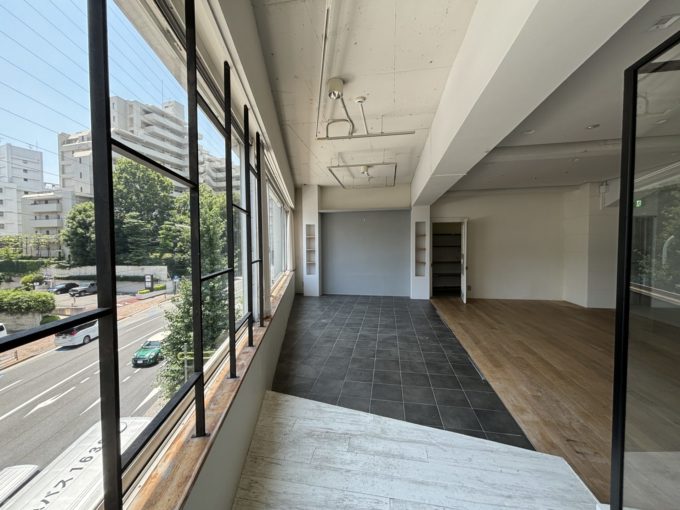 3階はまた少し仕様が変わって、ヨーロッパの一室みたいな本当にうっとり空間でした。スペースごとにタイル、フローリングと床の仕様が異なります。窓面は目黒通りに面していて南向きなので、明るいですし天井高が3mあり開放感と自由さに溢れています。また、ディスプレイの造作壁や、フロアの1/3ほどが事務所仕様の部屋になっています。