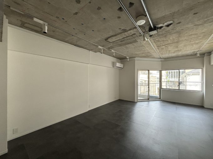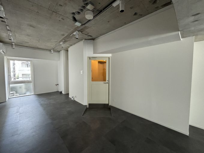室内の仕様は床のテイストだけ異なり、2階はグレーの塩ビタイル、7階はカーペットになっています。壁は白いボードとクロス、天井はコンクリート剥き出しの躯体現し。天井の無機質さが室内の空間をグッと締めていてます。