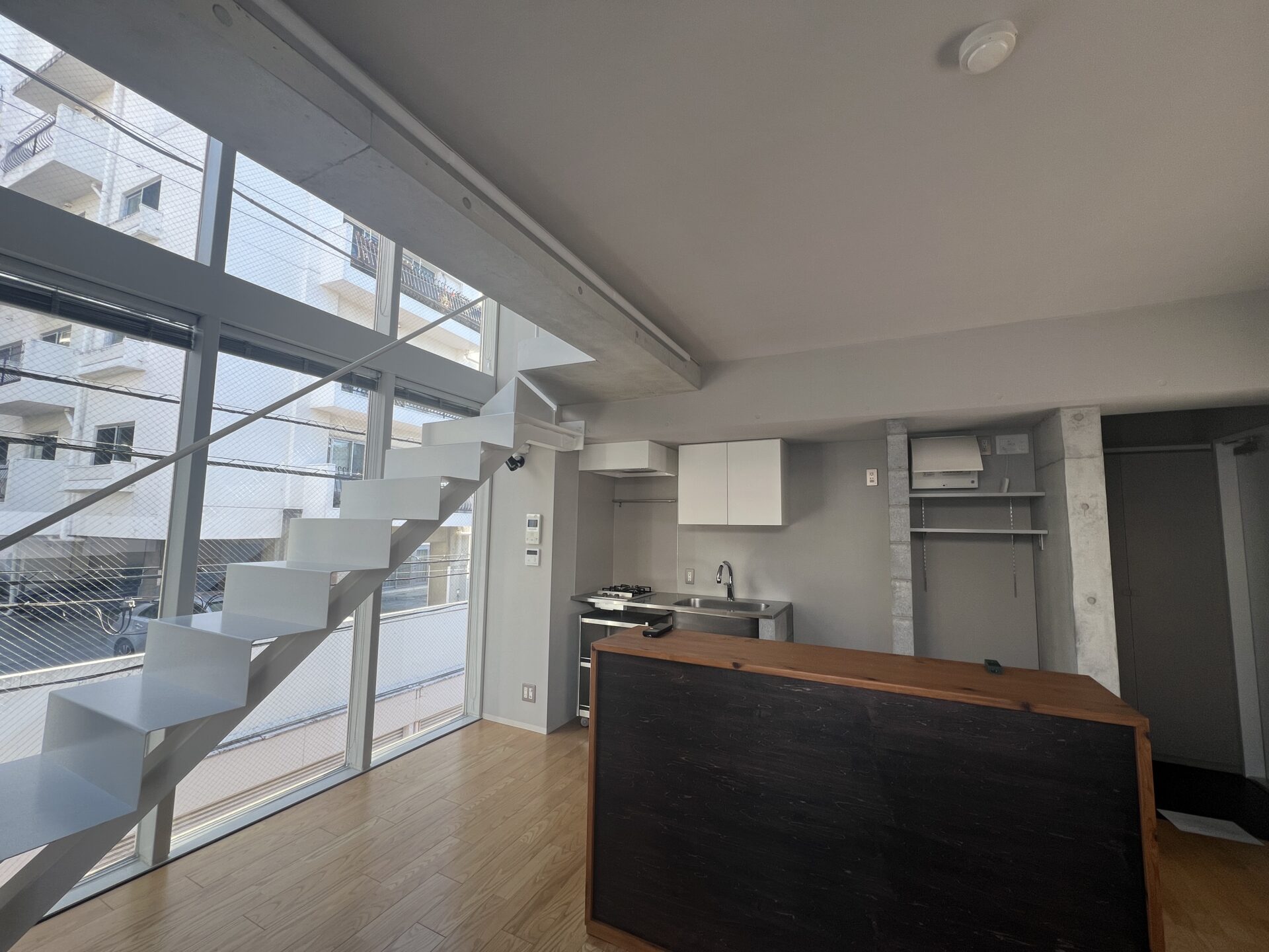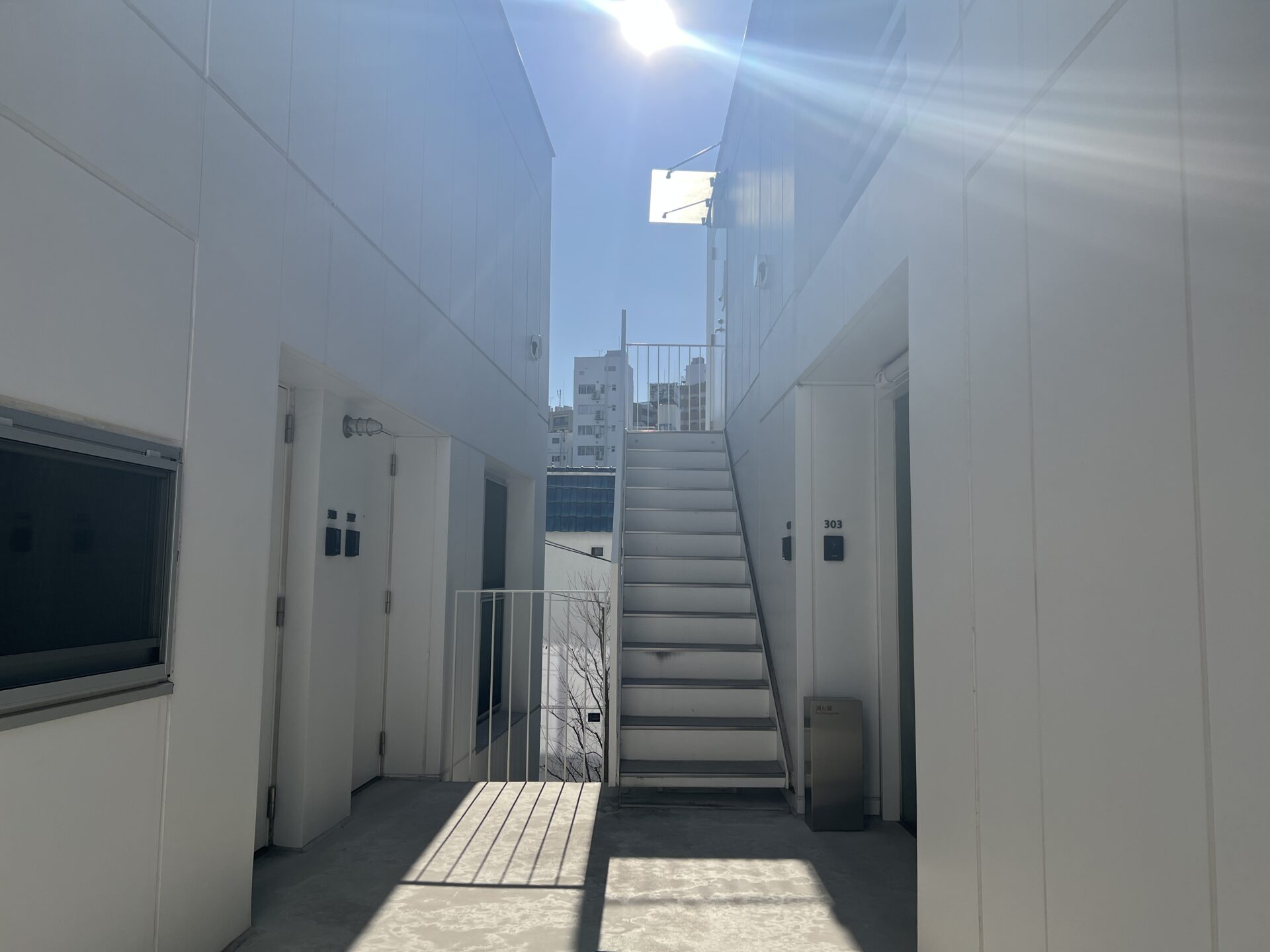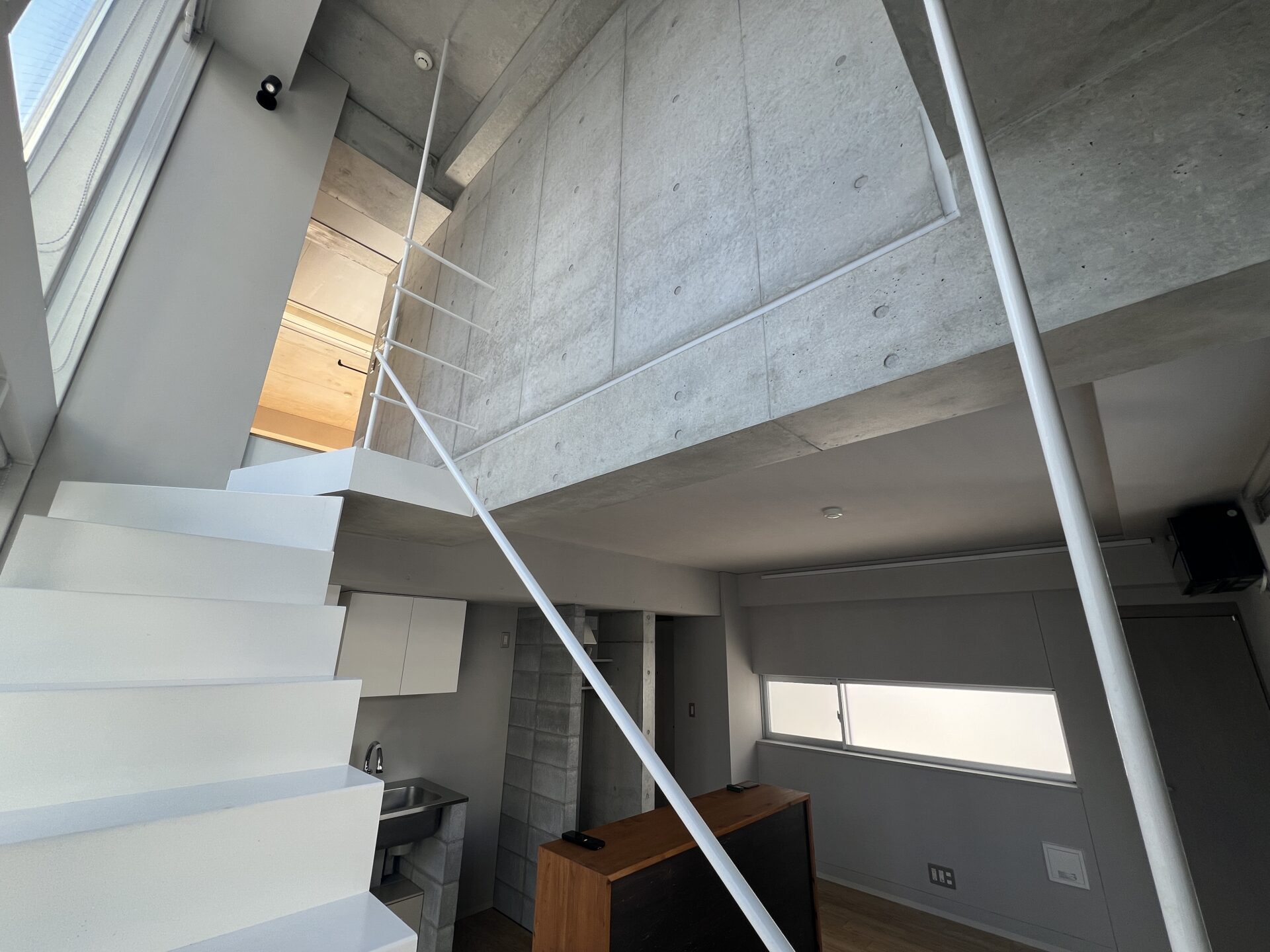 現地で初めてこの物件を見たとき、強く印象に残ったのが「階段を上るのが楽しい」という感覚でした。建物自体は白い壁で取材日が晴天日だったこともあり、青空と白い壁とのコントラストがとても美しかったです。部屋のドアに行くまでの階段の登り降りでさえ楽しく感じられるほど。室内もメゾネットタイプで、白いスチール階段が空間のアクセントに。