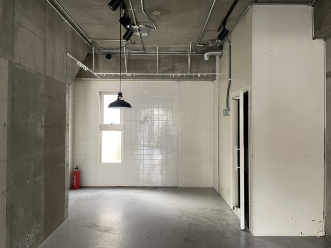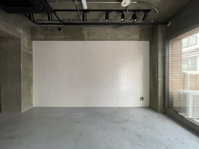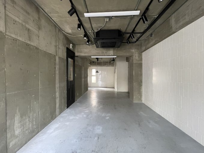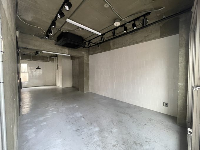 ビルの間にある細長い階段登り二階部分が今回の募集区画だ。室内が覗ける小窓付きのレトロ風な扉が設置されている。室内はコンクリ×白タイルのかわいいコラボだ。前テナントはアパレルショップ。ライティングレールとトイレ残置物として残っている。小規模のショップやショールームにするには申し分ないスペースだ。窓面にはディスプレイが魅せれらるスペースもある。