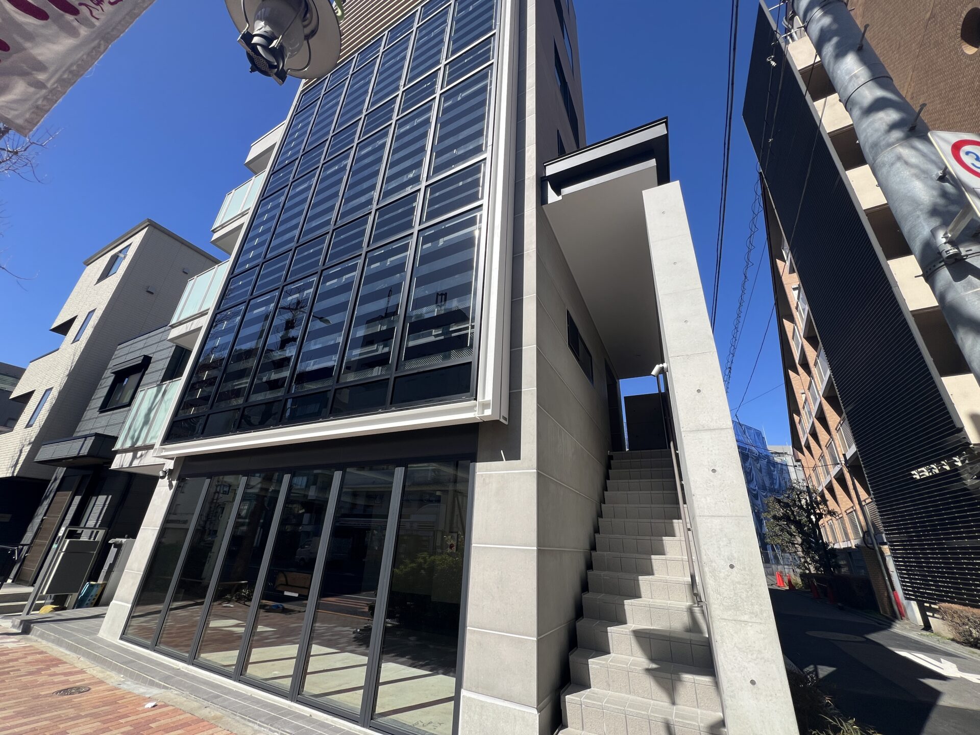 築年数は2026年2月の新築ほやほやです。まだ誰の色にも染まっていない。外観はガラス張りが目立つかと思いきや、さりげなくシェードがつけられているのでどことなく控えめ。所在階は2階ですが、建物右側に外階段が付いているので、入店・入室までの動線はいいですね。