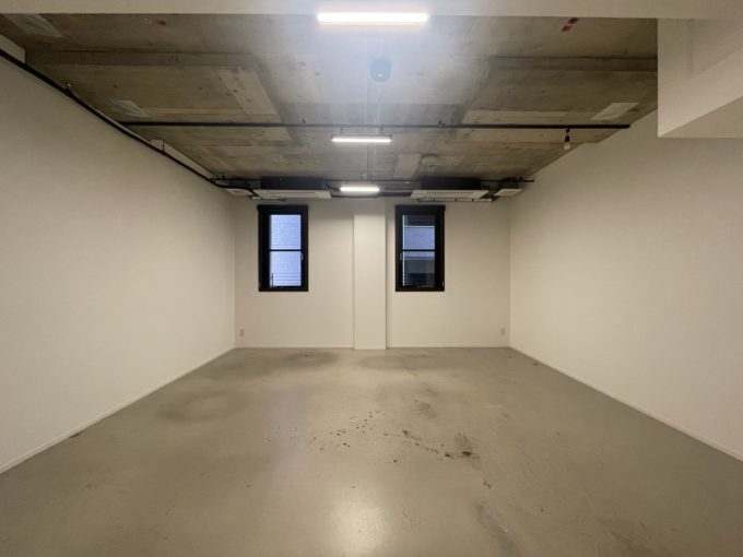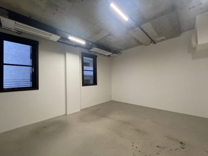 区画の中でも一番大きい05室含む複数が募集中です。床はコンクリート打ちっ放しにクリア塗装。壁は白いクロスで天井はスケルトンに、空調・ライティングレールが設置されています。