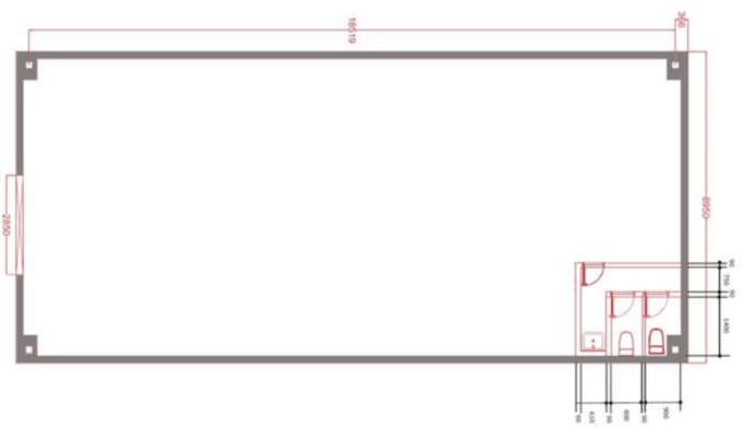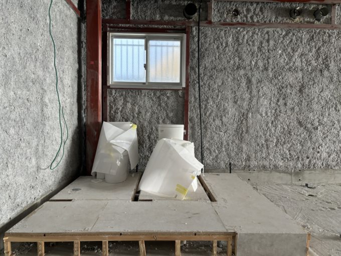 入り口から入って右奥には新品の温水器つきトイレが2台置かれていました。スケルトントイレというのもなかなか見る機会がなく、なんともシュールな絵面です。最低限の設備は整えられた1番いい状態なのではないでしょうか。水回りは配管で20cmほど床上げしてあります。床を全部作るとなると天高も変わってきそうですが必要箇所だけ床上げして、あとは躯体を生かしたいところです。砂砂しい感じではあるので、フラットにハツってクリア塗装でしょうか。