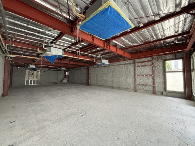 現在は床、壁、天井は躯体現しのスケルトンになっています。エンジ色の鉄骨がグレーの躯体と相まって良い味を醸し出しています。空調は5台ついており、だいたい10坪に1台というベース通り申し分なしです。天高は一番高いところで3.4mあり、ハリ下でも3mはあります。