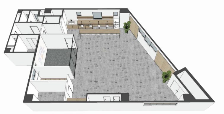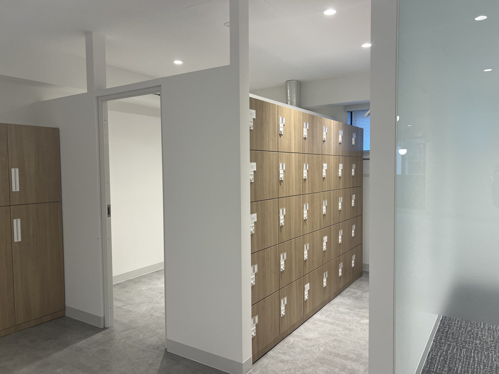 ただのワークスペースではありません。専有部の中にミーティングルームがあり、個人ロッカーも完備されています。奥には“倉庫のような収納スペース”も。防災備蓄を置くにも良さそうです。お手洗いは階数ごとに男女が分かれて設置されています。働きやすいのちょっとした配慮が感じられました。