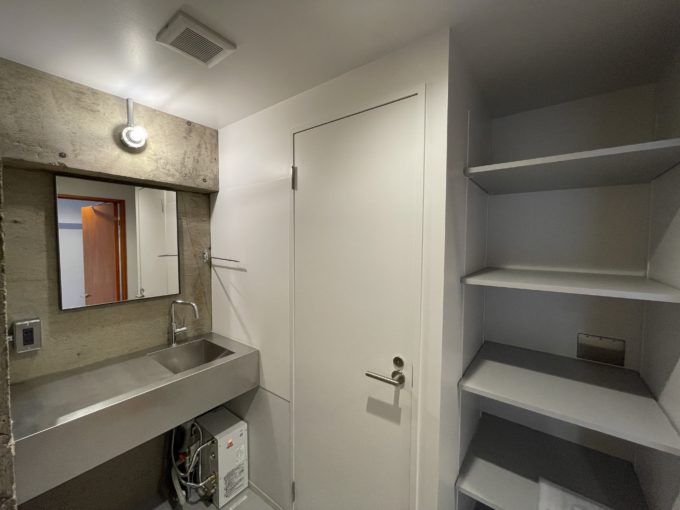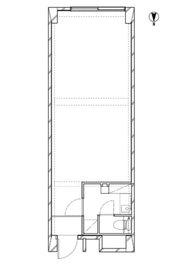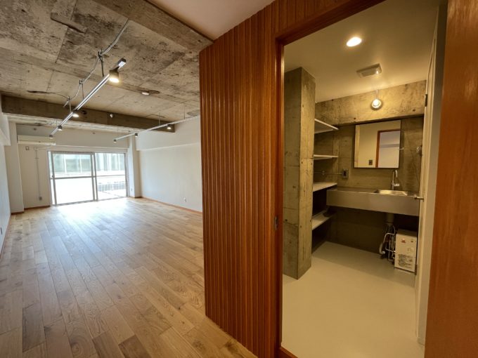 南向き10坪の長方形の物件。1階ではあるが、エントランスまで階段で数段上がり、目の前に高い建物が隣接していないため、扉をあけた瞬間に光が入ってきて明るい。コンパクトかつシンプルながら、天井のスケルトンと木目の相性が抜群におしゃれだ。入り口右手にあるウッドBOXな空間は水回りがまとまっており、トイレとシンクがある。