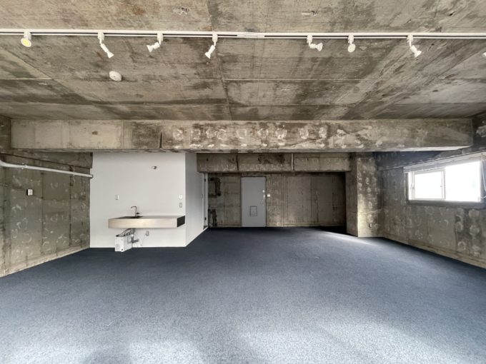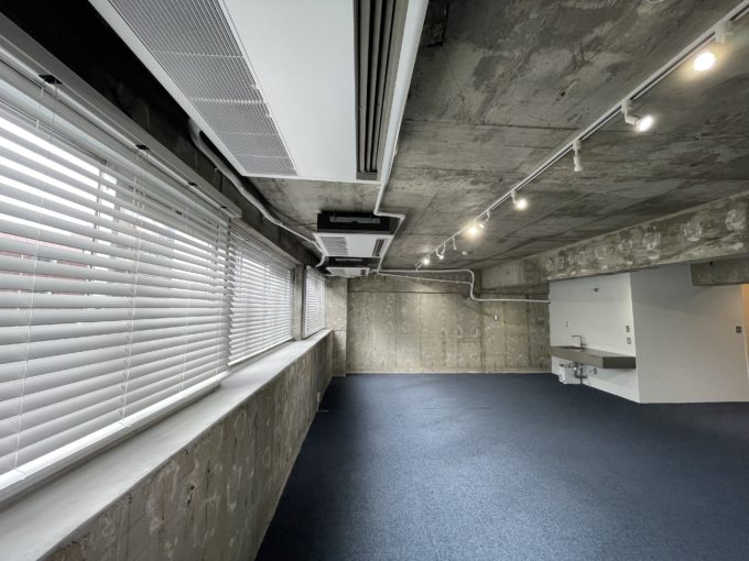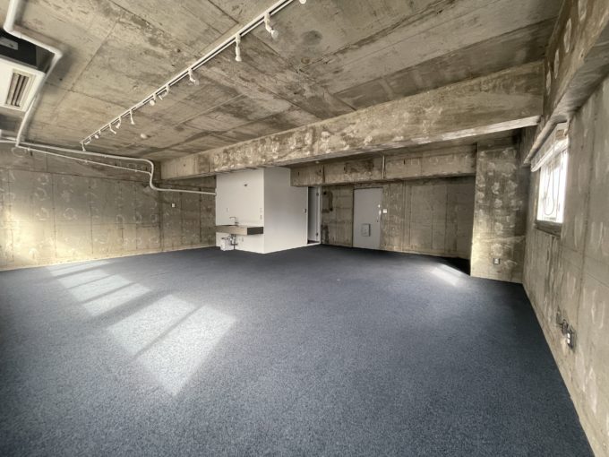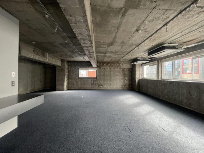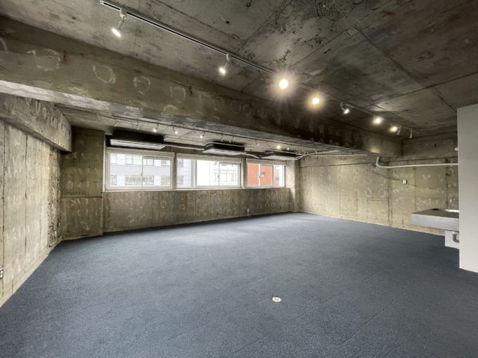 躯体剥き出しの荒々しいまんまスケルトン壁や天井に最低限の設備を入れたTHEスケルトンオフィス。前テナント造作のためミニキッチンやトイレなど全て残地物扱いですがとても素敵に仕上げられているため、完全スケルトンに比べ大幅に手間やコストをカットすることができる。角部屋のため採光も二面から取れ、骨董通りを見下ろすことができる。